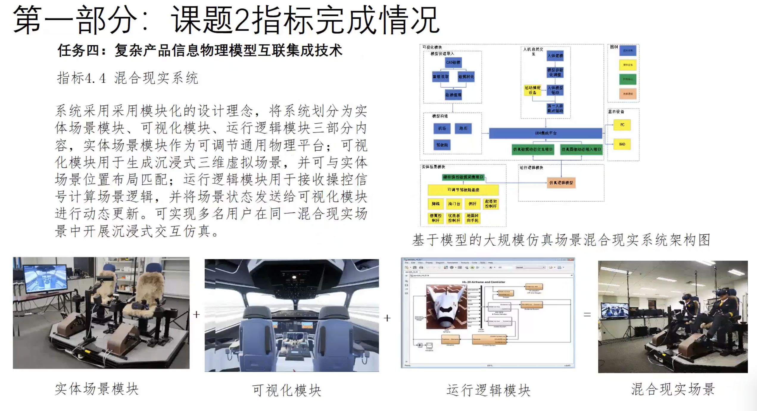 五.课题四进展汇报 课题四由北京仿真中心的刘泽伟工程师进行介绍。首先介绍了课题四的指标完成情况,指出目前课题四的论文、软著指标已基本达到了要求,25个工业单位应用验证已经开展。接着刘泽伟进行了应用示范验证的PPT展示。铁鸣博士针对临近空间的应用案例进行了详细展示。中船刘敬工程师针对航空保障系统进行了应用验证展示。最后张霖教授指出,各应用验证方需要协调筹备好最终的应用验证演示工作。
