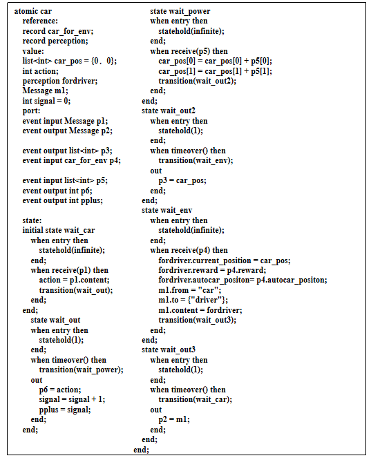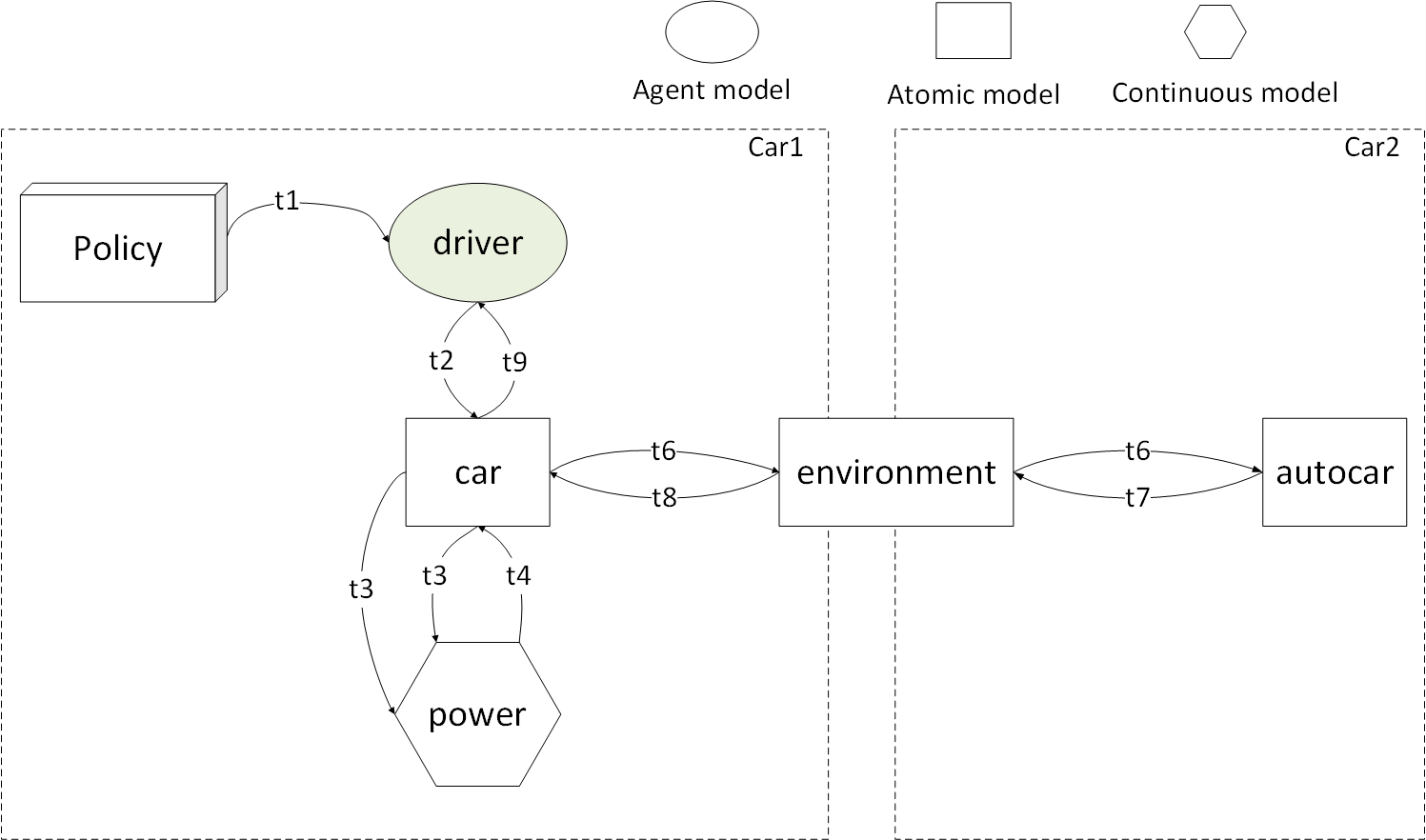 The model structure of the driving model is shown in Fig. 1, where car1 is a manned car, or understood as "intelligent car", and car2 is an unmanned car, or understood as "non-intelligent car". car1 contains three types of models, namely, the driver module composed of intelligent body models, the car module composed of discrete models, and the power module composed of continuous models. Car1 contains three types of models, namely, driver module composed of intelligent body models, car module composed of discrete models, and power module composed of continuous models. Car2, on the other hand, contains only one discrete model, which is used to interact with car1. In order to show the whole modeling and simulation process based on X language more clearly, the interaction logic and sequence between each model are clearly defined, as shown in Fig. 1. The intelligent body model driver first makes decisions using the trained policies and passes the action results to the discrete model car, the car module passes the driver's actions to the power module to generate feedback on the car's dynamics based on the actions, and finally the car changes its actual position based on the amount of change returned by power, and affects the environment by sending it to the The car changes its actual position according to the changes returned by power, and sends it to the environment to influence the position of car1 in the environment, thus completing a cycle of car1's movement. During this process, the environment also collects the position of car2 and feeds back to car1, so that car1 can actively avoid car2 to prevent accidents. The whole model simulates the system model of driving a car in the real world, which consists of three types of models: continuous, discrete, and intelligent body in X language. In order to show the modeling process based on the X language more clearly than a better simulation of the real scenario, we have rationally simplified the complex dynamics process, the dynamic environment, and the multi-type interaction process.