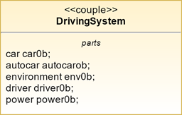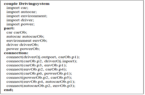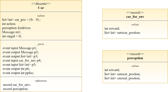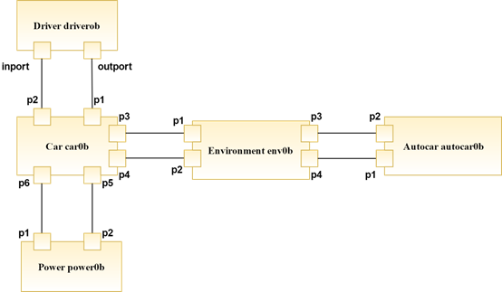 For this case, this paper first establishes the top-level model of the whole driving model (including both graphical modeling and textual modeling), which is composed of one driver, two vehicles, one vehicle powertrain module, and one given environment module. The definition diagram of the system design of the whole system as well as the connection diagram are shown in Figures 2 and 3, where the diagram defines the constituent modules of the whole system and the connection diagram defines the connection relationship between the modules. The simulation text of the top-level model of the whole system is given in Fig. 4. After that, this paper models each module in the whole system in detail (including both graphical modeling and textual modeling forms) . For example, Fig. 5 and Fig. 6 describe the structure and behavior of the car module in car1 by designing its definition diagram and state machine diagram, respectively. The simulation text of the car module is given in Fig. 7. Finally, all the simulation texts are interpreted through the X language interpreter for simulation to obtain the simulation results.