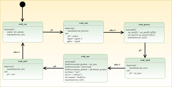 From Fig. 3, it can be found that the running order of the whole model is consistent with the modeling order in Fig. 1, reflecting the simulation process of the coupled model consisting of continuous, discrete and intelligent body models. Among them, the power output will exist continuously throughout the simulation and produce interactive behaviors with the car model when the interaction conditions are satisfied. The simulation process of the intelligent body is consistent with the operation of the discrete model due to the nature of its discrete model.