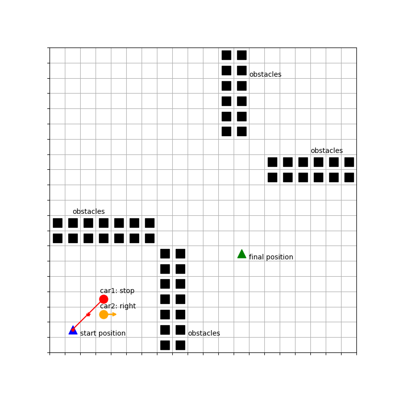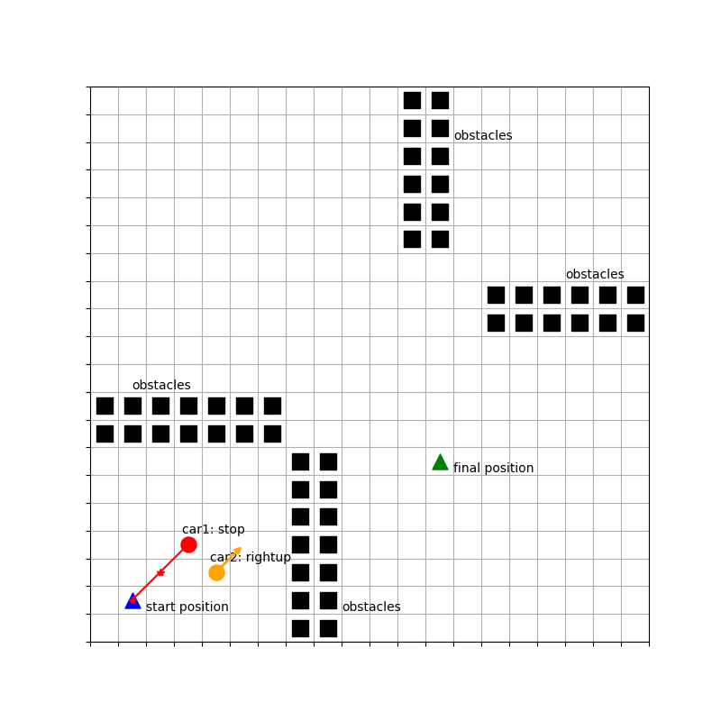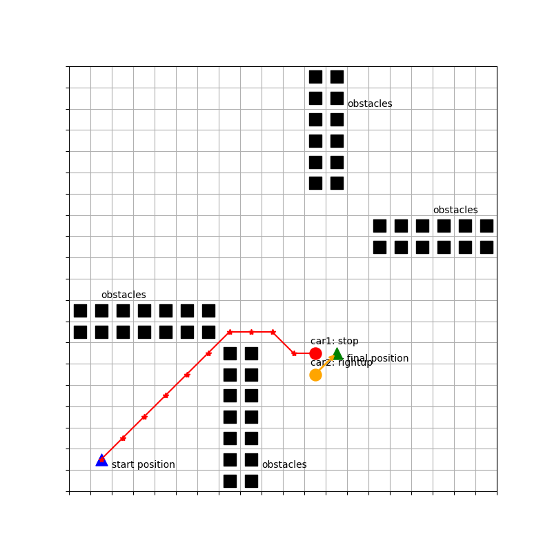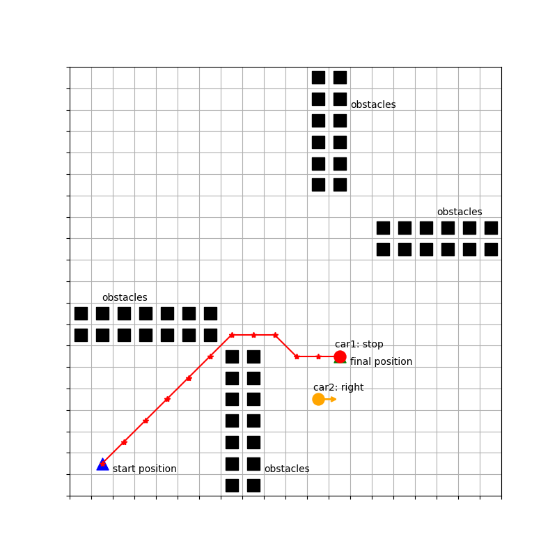 Based on the above model description, the simulation results of the driving model are visualized as shown in Fig. 2. The three diagrams (a), (b), and (c) represent the three interaction stages that car1 goes through with car2 on the way to the destination, in each interaction car1 stops its current action and waits for car2 to move away before acting again, and figure (d) shows the complete trajectory of car1 from the initial position to the final position. In the simulation results shown in Fig. 2, each step of car1 goes through the t1-t9 interaction process shown in Fig. 1.