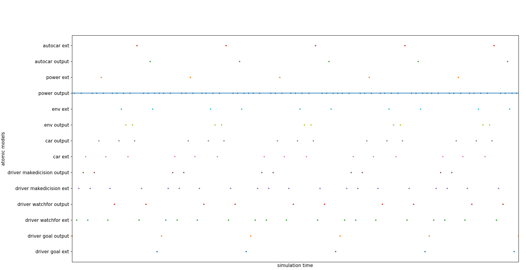 Since the X language emulator is built following DEVS, there is a time advancement process of discrete events during the running of the module, as shown in Figure 3 for the whole system. The horizontal coordinate shown in Figure 3 is the simulation advancement time, while the vertical coordinate represents the transfer order of the output events and external events of the underlying atomic model simulator corresponding to different kinds of models described by the X language, e.g., driver watchfor ext and driver watchfor output represent the external event transfer and output of the atomic model of the driver plan, respectively. function, the process of internal event transfer is included in the process of the output function, which is consistent with the event transfer process of the DEVS atomic model itself.